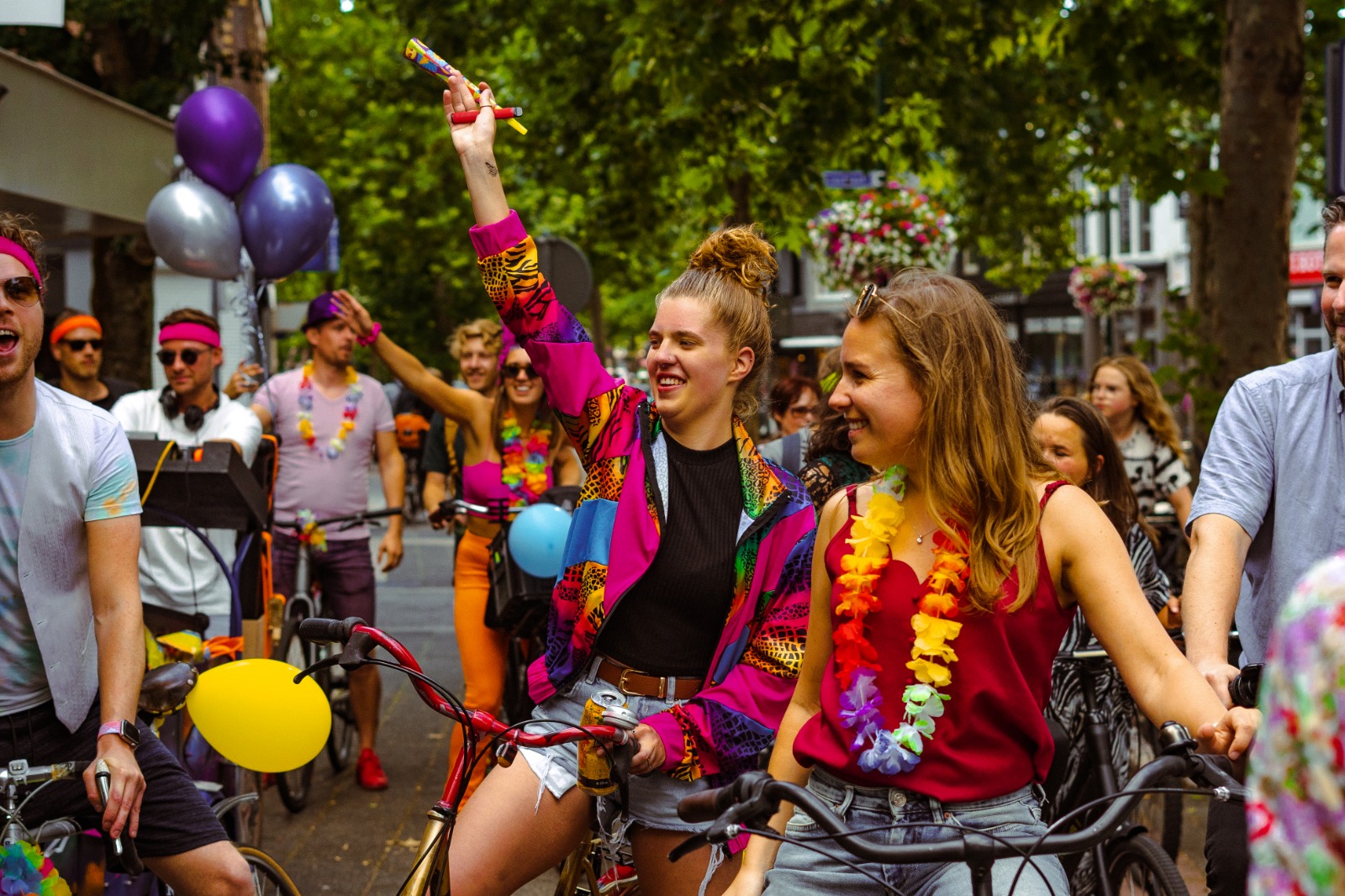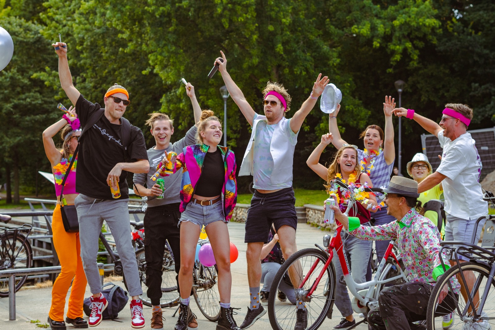 Een aantal versies verder vonden wij het nodig om BikeBizar nu echt groots en goed aan te pakken, zeker op de toekomst gericht waarin we Hilversum nog mooier maken! Wij zijn inmiddels verslaafd geraakt aan BikeBizar, ik kan mij geen 1 moment bedenken waarin ik wakker ben geworden met nieuwe ideeën voor BikeBizar, Rook? lasers? nog gekkere outfits!? Maar buiten deze gekkigheid vinden we onderstaande punten ook erg belangrijk! lees het rustig door! Feestelijke sfeer: Bikebizar is bedoeld om een feestelijke en gezellige sfeer te creëren waarin mensen kunnen dansen, zingen en genieten van de muziek en de omgeving. De focus moet liggen op het plezier hebben en het creëren van een positieve ervaring voor iedereen die deelneemt. Veiligheid: Hoewel Bikebizar bedoeld is als een feestelijke ervaring, is het belangrijk om de veiligheid van de deelnemers te waarborgen. Dit betekent dat er rekening moet worden gehouden met het terrein waarop Bikebizar wordt gebruikt, het verkeer, de weersomstandigheden en eventuele andere veiligheidsrisico's. Creativiteit: Bikebizar moet ruimte bieden voor creativiteit en zelfexpressie. Deelnemers moeten de vrijheid hebben om zichzelf te uiten op hun eigen manier en hun eigen persoonlijkheid en stijl te laten zien. Outfit: Het dragen van een gekke en opvallende outfit is sterk aangemoedigd tijdens Bikebizar. Denk aan felle kleuren, neonkleding, glitters, hoeden, pruiken en andere opvallende accessoires om de feestelijke sfeer te versterken. Dans: Naast het luisteren naar muziek, wordt er tijdens Bikebizar aangemoedigd om te dansen op een manier die past bij de muziek en de sfeer. Hierbij wordt aangemoedigd om jezelf volledig te laten gaan en te dansen alsof niemand kijkt. DJ&MC: De DJ die de muziek draait, kan de sfeer versterken samen met de MC en samen met de deelnemers aan te moedigen om gekke dansjes te doen, mee te zingen met de muziek en andere feestelijke activiteiten te ondernemen. Verlichting: Het gebruik van verlichting, zoals feestelijke lampjes, kan de feestelijke sfeer van Bikebizar nog meer versterken, vooral in de avonduren. Aangezien een avond versie ons ook fantastisch lijkt, om uiteindelijk weer in een kroeg, of club te belanden waar we vrolijk verder gaan!